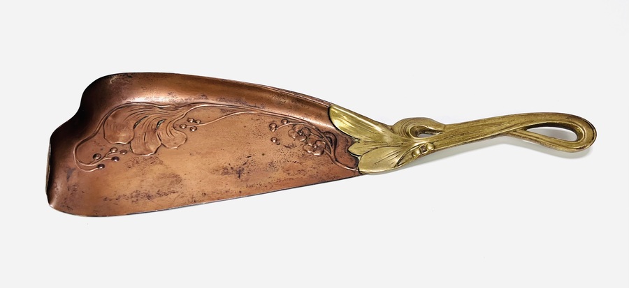 Een kruimelbakje uit de Art Nouveau periode, circa 1900. Het object is vervaardigd uit koper en met een messing handvat. Het koperen blad is gedecoreerd met een bloem en bessen reliëf, typerend voor de stijl rond 1900. De steel heeft een organische vorm die doet denken aan een bloemstengel.