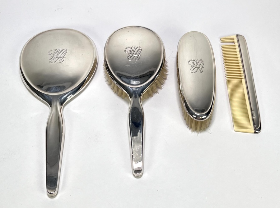 Een vierdelige kapset van sterling zilver, daterend uit circa 1950. De set bestaat uit twee borstels, een handspiegel en een kam met een kunststof blad. Het zilverwerk is voorzien van een gegraveerd monogram 'WA' en is gekenmerkt met 'STERLING 925'.