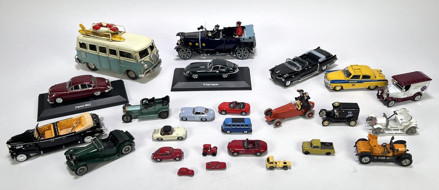 Verzameling van diverse speelgoedauto's waaronder een model van Kuifje. Het kavel omvat miniatuurmodellen van klassieke en moderne auto's, vervaardigd van metaal en plastic. De collectie is samengesteld uit verschillende merken en modellen, 20e eeuw.