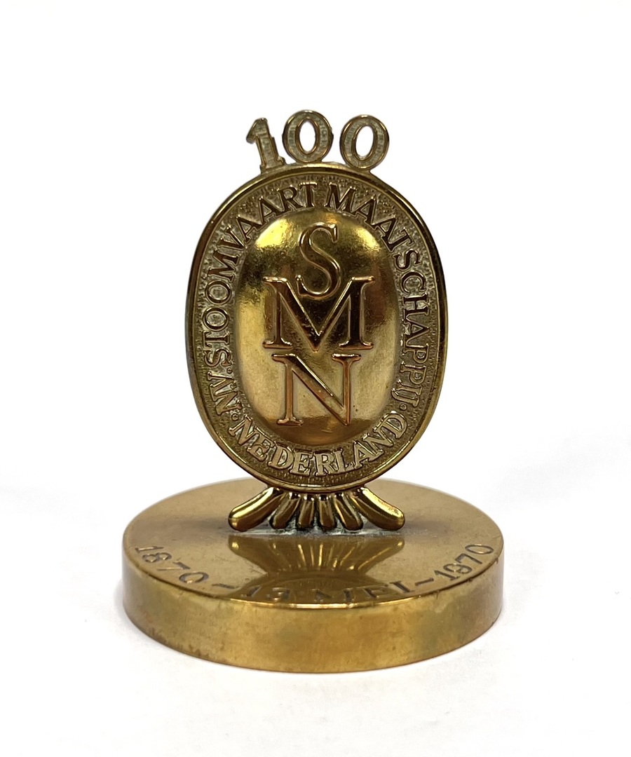 Messing presse-papier ter ere van het 100-jarig jubileum van de Stoomvaart Maatschappij Nederland (SMN) 1970. Uitgevoerd in reliëftechniek met de inscriptie “1870 – 13 MEI – 1970” aan de voorzijde. Het object toont centraal het bedrijfslogo met de letters “SMN” omgeven door de naam van de rederij. Vervaardigd in 1970.