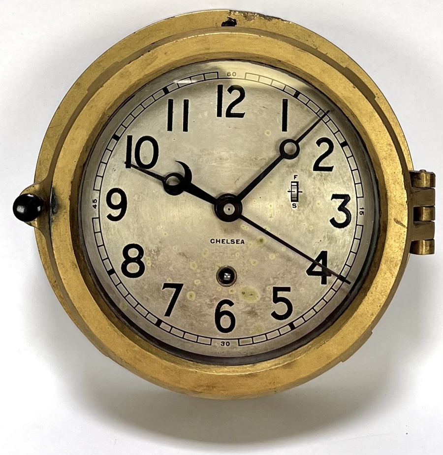Maritieme klok vervaardigd door Chelsea Clock Co. (Boston, opgericht 1897). Uitgevoerd in messing met glazen front en mechanisch uurwerk, voorzien van Arabische cijfers en zwarte wijzers. Aan de achterzijde gegraveerd en gestempeld met “CHELSEA CLOCK CO. BOSTON” en serienummer 473297. 20e eeuw. De klok toont een functionele maritieme vormgeving met een patina die kenmerkend is voor langdurig gebruik op zee.