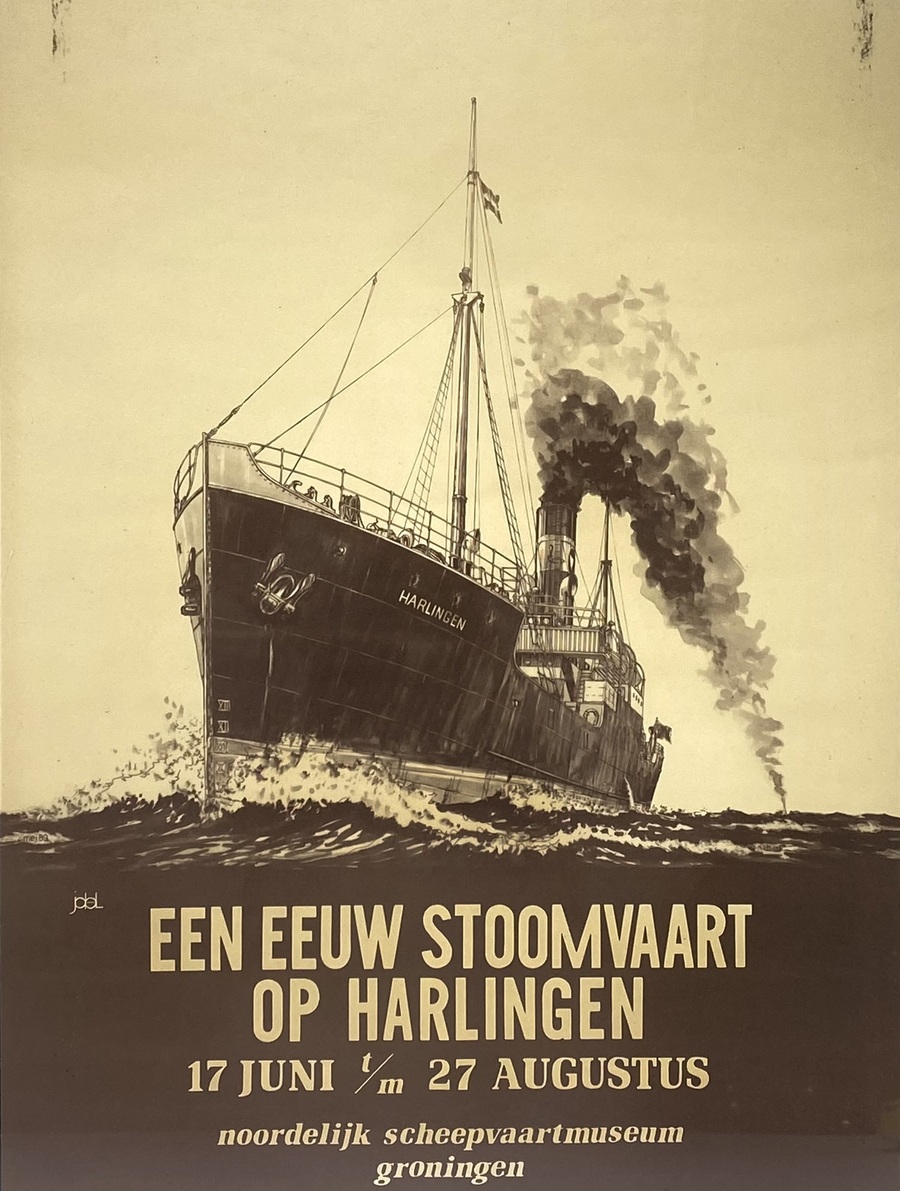 Affiche uit circa 1960 voor een tentoonstelling 'Een eeuw stoomvaart op Harlingen' in het Noordelijk Scheepvaartmuseum in Groningen. De poster is uitgevoerd in een tweekleurige druk op papier en toont een stoomschip genaamd 'HARLINGEN'.
