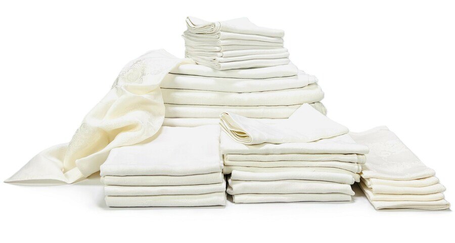 Een collectie van damasten textiel waaronder tafelkleden en servetten, ontworpen voor gebruik in formele eetomgevingen, uit de 20e eeuw.. De damast heeft een glanzende textuur en is versierd met diverse patronen. Het kavel omvat verschillende formaten en designs.