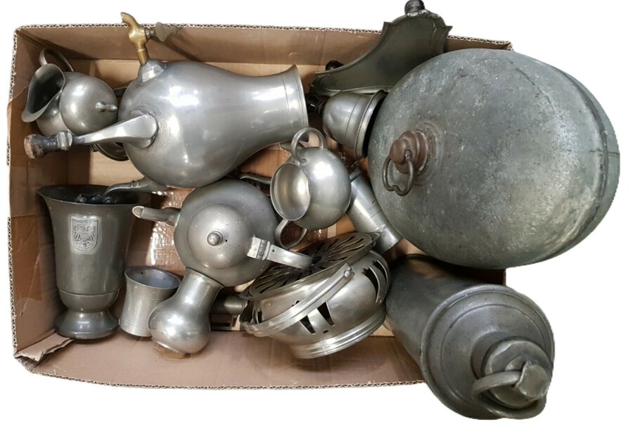Een gevarieerd kavel van tinnen en metalen objecten, daterend van midden 20e eeuw. De collectie bestaat uit een mix van verschillende objecten waaronder theepotten, kannen, warmhouders en bekers.