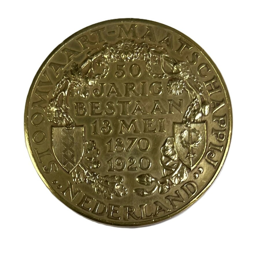 Bronzen penning ter herdenking van het 50-jarig bestaan van de Stoomvaart Maatschappij Nederland, uitgegeven in 1920 en gegrafeerd door Johannes Cornelis Wienecke (1872-1945). De penning is aan de voorzijde gedecoreerd met een herdenking tekst tussen de schilden van Amsterdam en Batavia. De achterzijde toont het schip genaamd "De Jan PieterZn Coen".