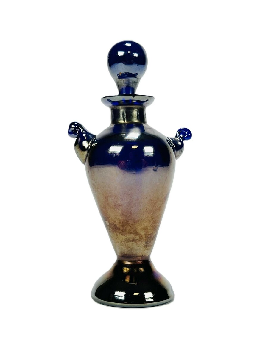 Art Deco parfumflesje uit kobaltblauw glas met metallic irisatie uitgevoerd in een amfoorvorm met twee oren en ronde stop, vervaardigd in handgeblazen techniek. Het object toont kleurverloop van diepblauw naar goudbruin en is voorzien van een passende glazen stop.