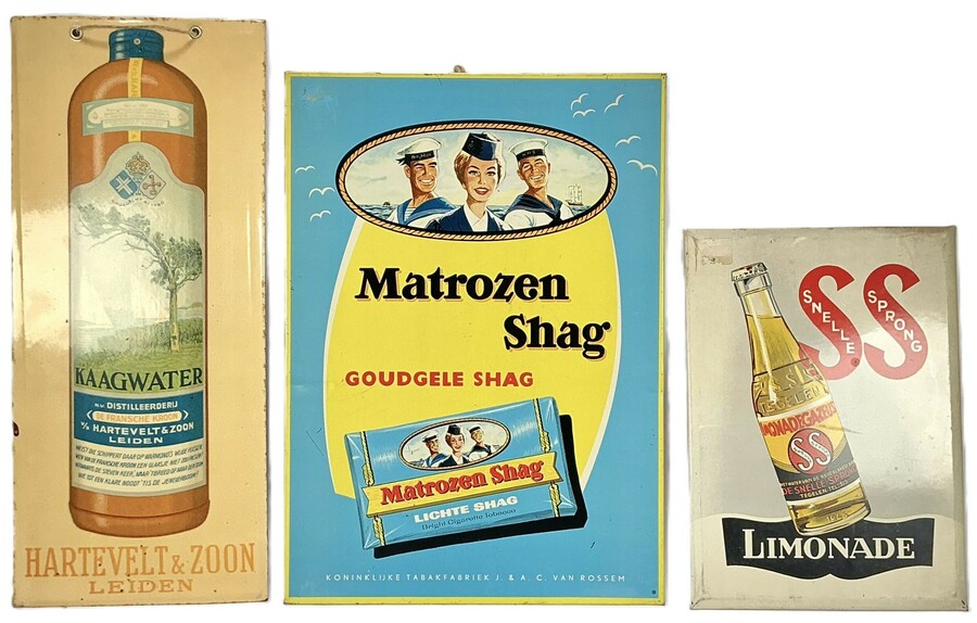 Set van drie vintage blikken reclameborden uit de midden 20e eeuw, uitgevoerd in meerkleurige techniek. De borden tonen reclame-uitingen voor Hartevelt & Zoon Kaagwater, Matrozen Shag en Snelle Sprong limonade. Grafische stijl met typerende illustraties en merktypografie. Voorzien van ophangvoorzieningen aan de achterzijde.