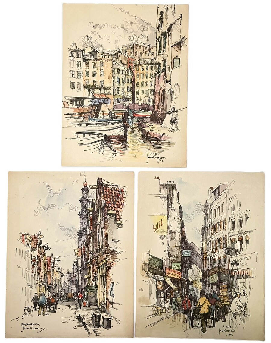 Drie prenten door Jan Korthals (1916–1972), uitgevoerd in pen en inkt met aquarelaccenten op papier, gesigneerd rechtsonder, waarvan één werk gedateerd 1953. De prenten tonen stadsgezichten van Amsterdam, Parijs en Camogli. De impressionistische stijl wordt gekenmerkt door losse lijnen, sfeervolle kleurtoetsen en levendige straatbeelden met figuren en architectuur.