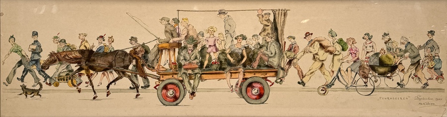 Offset litho op papier van Han Rehm (1908–1970), getiteld “Fourageeren”, met potlood gesigneerd rechtsonder en gedateerd september 1944. Uitgevoerd in cartooneske stijl met verhalende en documentaire elementen toont de litho een lange stoet van mensen met een kar getrokken door een paard, op zoek naar voedsel. Voorstelling van burgers in beweging tijdens de Hongerwinter.
