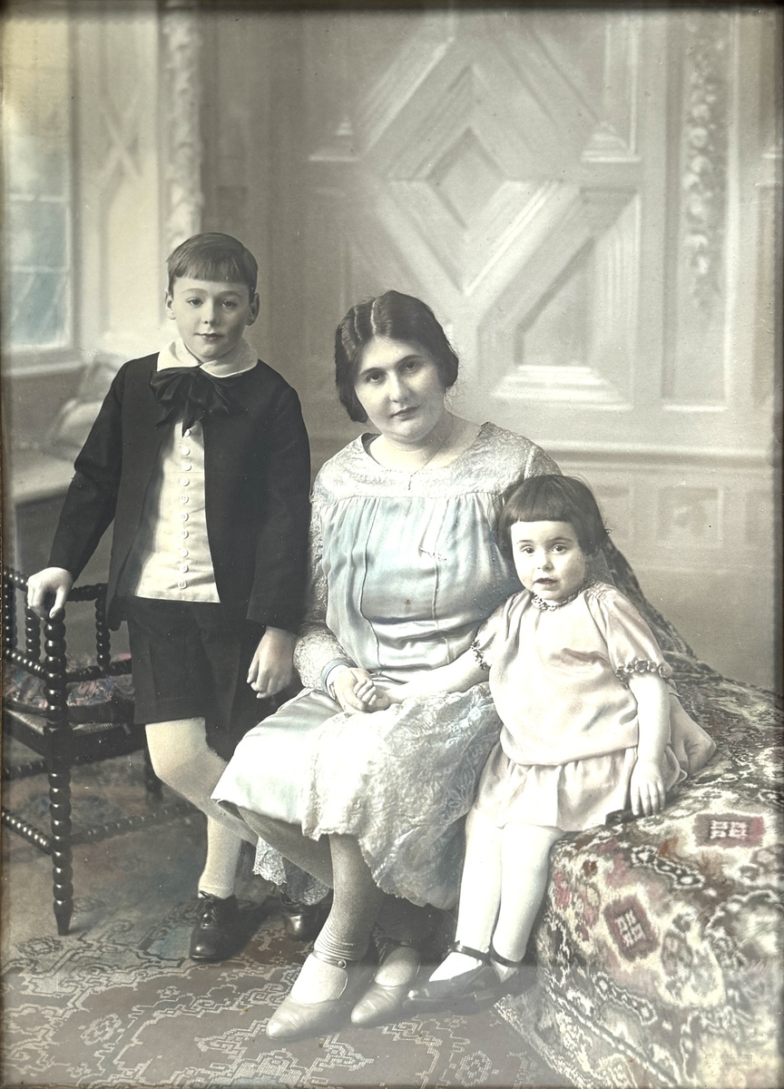 Deze ingelijste fotoprint, gedateerd circa 1920, is een handgekleurde zwart-wit foto. Het portret toont een vrouw met twee kinderen in een formele studio-omgeving. De techniek van handmatig inkleuren van de fotoprint was een gangbare praktijk in die periode. De foto is ingelijst in een houten lijst met een goudkleurige afwerking.