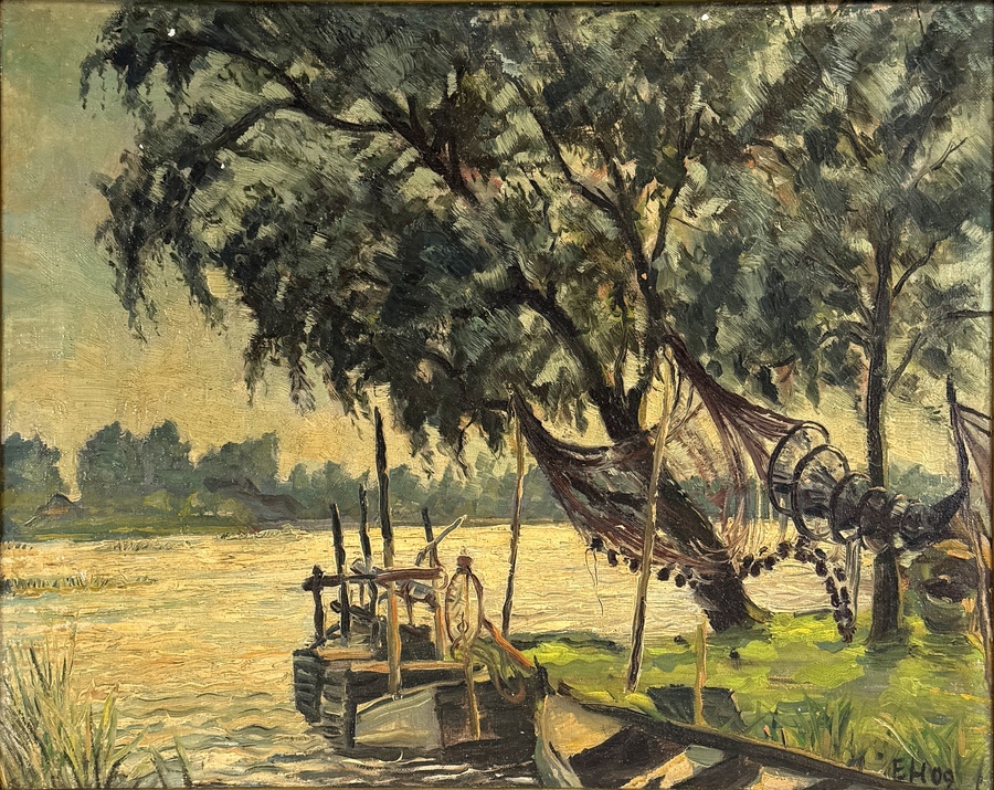 Schilderij olieverf op doek, gesigneerd rechtsonder “EH09”, uitgevoerd in impressionistische stijl. Het schilderij toont een rivierlandschap met vissersboten, netten en bomen langs de oever. De penseelvoering is los en dynamisch, met aandacht voor licht en kleurcontrasten in water en gebladerte. Het werk is opgespannen op spieraam met houten sleutelstukken en gevat in een geprofileerde goudkleurige lijst.