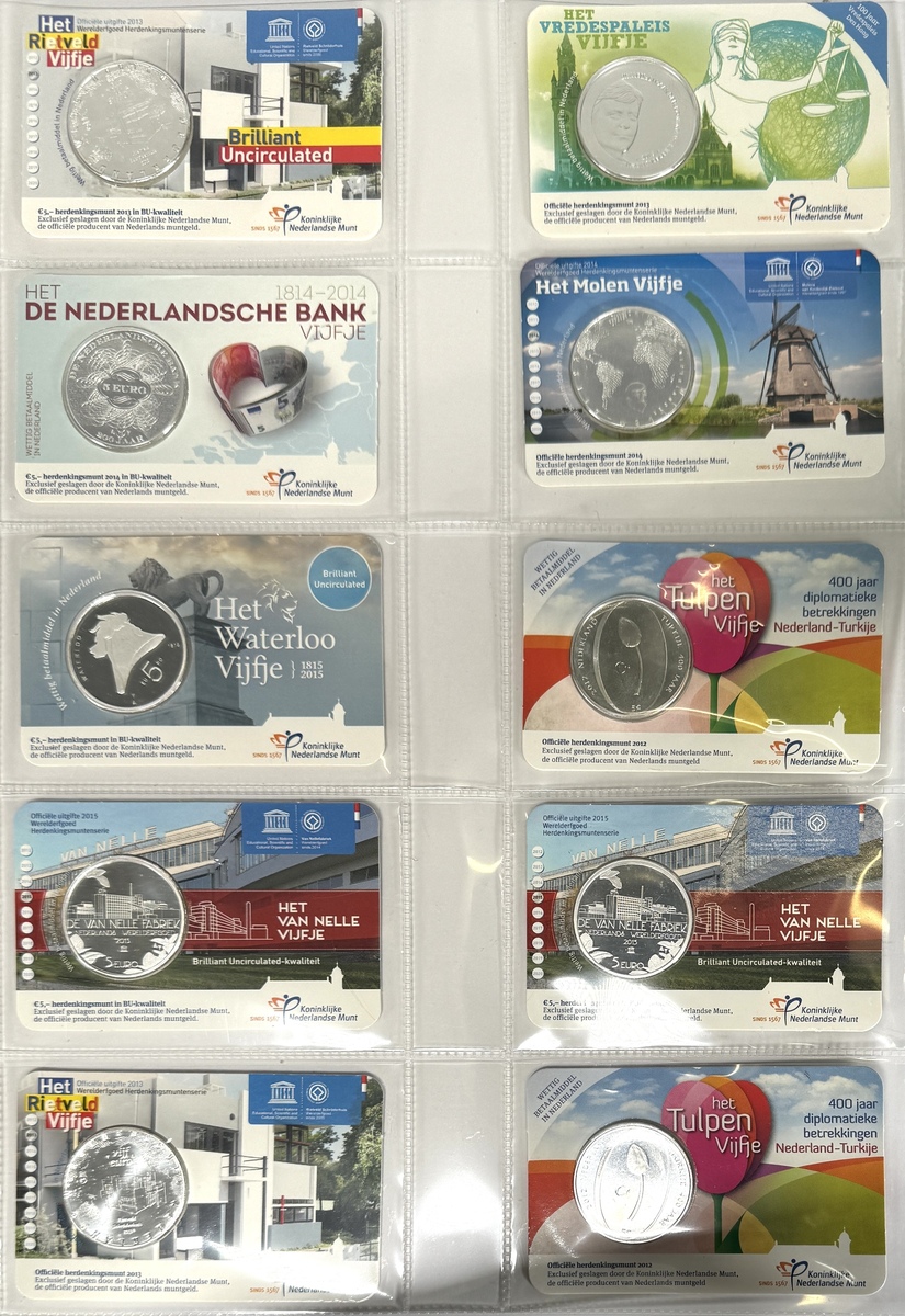 Een kavel van tien Nederlandse verzilverde herdenkingsmunten van €5. De munten, geslagen in de jaren 2013-2015 in Prooflike en Brilliant Uncirculated kwaliteit, zijn in hun originele verpakkingen van de Koninklijke Nederlandse Munt. De ontwerpen van onder meer Erik van de Veen en Rini Hurkmans herdenken onder andere de Van Nellefabriek, het Vredespaleis, de molen en het Rietveld Schröderhuis.