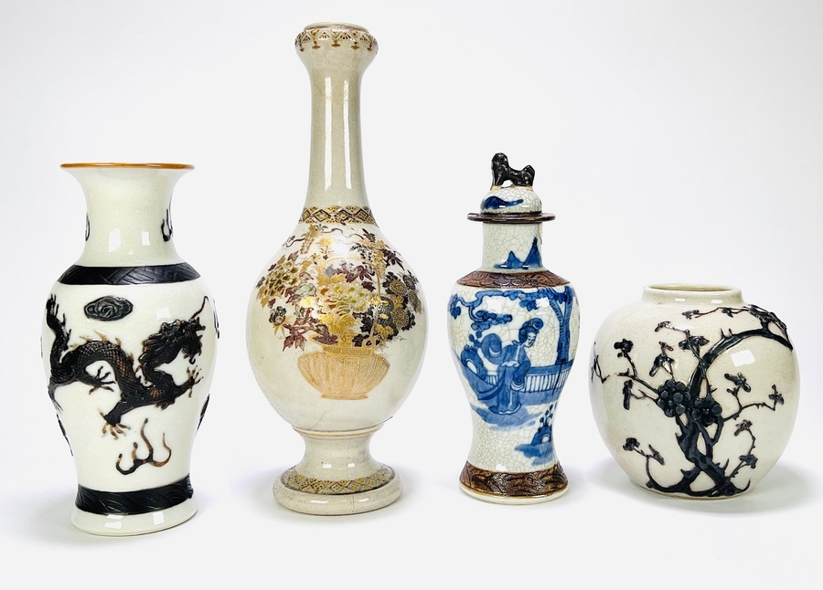 Convoluut porseleinen vazen uit omstreeks eind 19e eeuw tot begin 20e eeuw, uitgevoerd in craqueléglazuur met handbeschilderde decoraties en zwarte reliëfversieringen. Twee vazen zijn onderaan gemerkt met Chinese karakters.