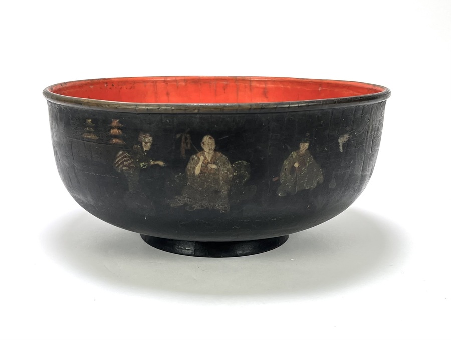 Gelakte houten kom uit circa eind 19e eeuw met zwart exterieur en rood interieur, uitgevoerd in Oost-Aziatische lakwerktechniek. De buitenzijde toont beschilderde scènes met figuren in goudtinten, deels vervaagd, binnenzijde egaal rood. Decoratief object met kenmerken van laat-Qing of vroeg-Meiji lakwerk uit China of Japan. Gemaakt met meerlaagse lak en handbeschildering.