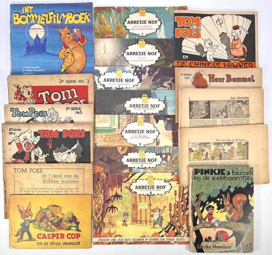 Verzameling stripboekjes met werk van Marten Toonder (1912–2005) en anderen, gedrukt op papier, circa 1940–1960. Bevat Tom Poes verhalen, een Bommel filmboek, uitgaven van Lieske Havelaar en meerdere Arretje Nof boekjes van Toonder Studio’s. Uitgevoerd in offsetdruk en zeefdruk, illustratieve stijl met cartooneske figuren.