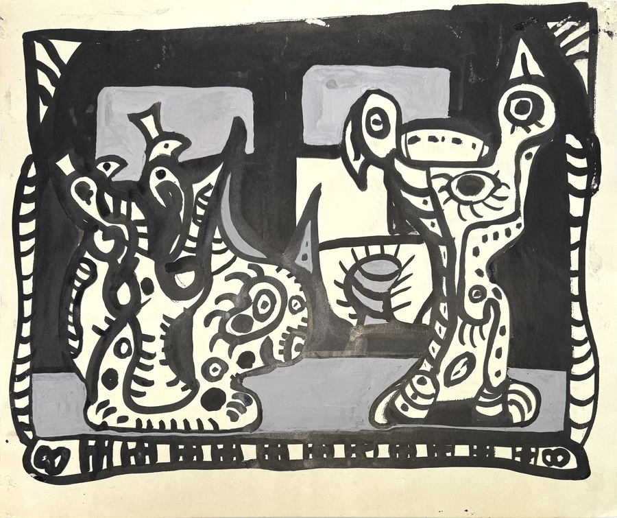 Een abstracte schilderij, daterend van midden 20e eeuw, uitgevoerd in gouache op papier. Het werk toont twee abstracte figuren met uitgerekte lichamen en cirkelvormige ogen. De compositie is opgebouwd uit dikke lijnen en geometrische vormen in zwart en grijs.