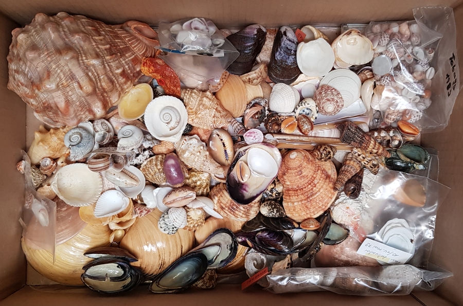 Verzameling van diverse schelpen samengesteld uit verschillende soorten en formaten met variërende kleuren en structuren zoals glad, geribbeld, glanzend en mat. De collectie bevat onder meer slakkenhuizen, wulken, kokkels, mosselen en scheermessen.