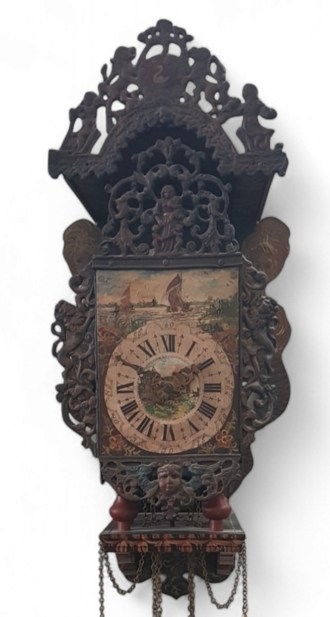 Friese stoelklok, einde 18e eeuw, uitgevoerd in hout en metaal met rijk gesneden en opengewerkt decor. De beschilderde wijzerplaat toont een Hollands rivierlandschap met zeilschepen. De klok is voorzien van een kettingmechaniek met messing gewichten en een slinger.