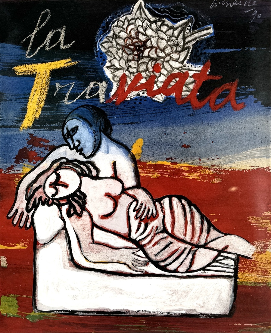 Ingelijste poster van Corneille (1922–2010) “La Traviata”, gedrukt op papier. De voorstelling toont twee expressieve figuren in intieme pose tegen een dynamische, veelkleurige achtergrond. Het werk is gedrukt met signatuur en datum. De stijl is typerend voor Corneille’s late werk, waarin Cobra-invloeden gecombineerd worden met lyrisch expressionisme.