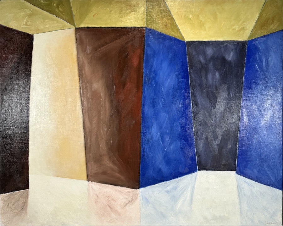 Schilderij door André Spruit (geboren 1941), uitgevoerd in olieverf op doek, vervaardigd in 1987. Abstracte compositie in geometrisch-abstracte stijl met verticale kleurvlakken in blauw, bruin, geel en zwart. De vlakverdeling wekt een ruimtelijke illusie. Rechtsonder gesigneerd en gedateerd; verso naamsvermelding, gedateerd en titel “Uitgang”. Het werk is een representatief voorbeeld van laat-20e-eeuwse geometrische abstractie.