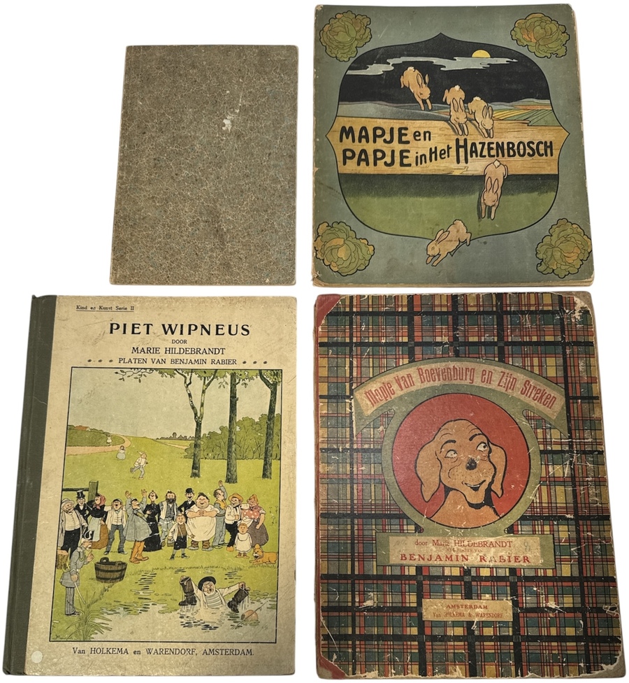 Verzameling kinderprentenboeken uit de late 19e tot vroege 20e eeuw, met werk van onder meer Marie Hildebrandt, Sibylle van Olfers (1881–1916) en platen van Benjamin Rabier (1864–1939). Uitgevoerd in papier en karton, gedrukt in kleur en deels met inkleuring. De boeken bevatten karakteristieke illustraties, rijmende teksten en thematiek rond moraal en dieren.