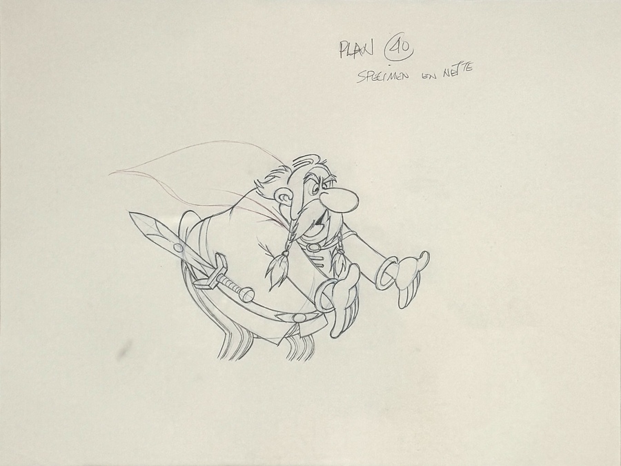 Productietekening van het karakter Abraracourcix, circa 1976, potlood op papier, ongesigneerd. Uitgevoerd in klassieke animatiestijl voor de film ‘Asterix verovert Rome’. Handgeschreven aanwijzingen aanwezig. Oorspronkelijk ontwerp van Albert Uderzo (1927–2020). Franstalig geanimeerd filmproject, ingelijst en voorzien van passe-partout. Voorzien van aanduiding “PLAN 40 SPECIMEN EN NETTE” boven het personage op het blad.