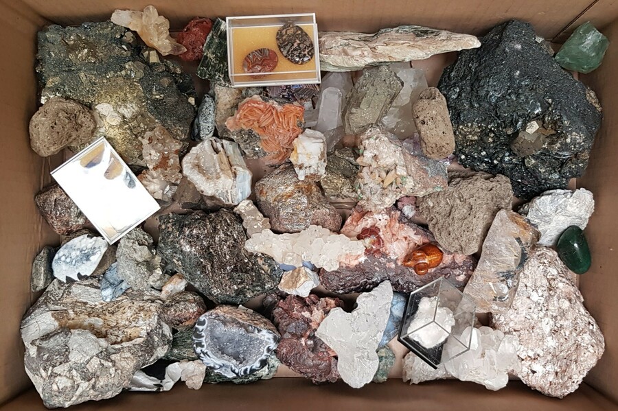 Een verzameling van mineralen en gesteenten, bestaande uit diverse soorten waaronder kwarts, pyriet, agaat, calciet en enkele gepolijste stenen in doosjes. De collectie omvat ruw materiaal, kristallen en ruwe ertsen. De mineralen variëren in vorm, kleur en textuur en enkele deels bewerkte specimens met kristalvorming, glans en geode-structuren.
