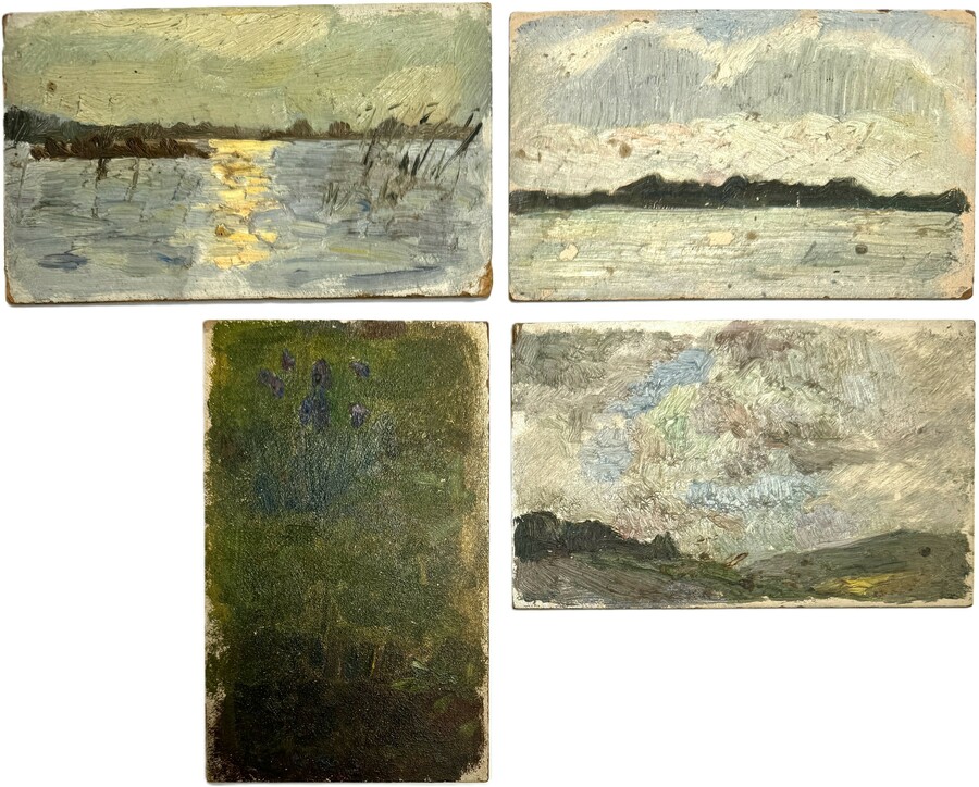 Set van vier miniatuur schilderijtjes van Reinhart Dozy (1880–1947), uitgevoerd in olieverf op schilders karton in impressionistische stijl. De scènes tonen landschappen en een bloem stilleven, met nadruk op lichtval, lucht en vegetatie. Begin 20e eeuw, eén achterzijde met potlood gedateerd 1903. Afkomstig uit de collectie van de zoon van de kunstenaar.