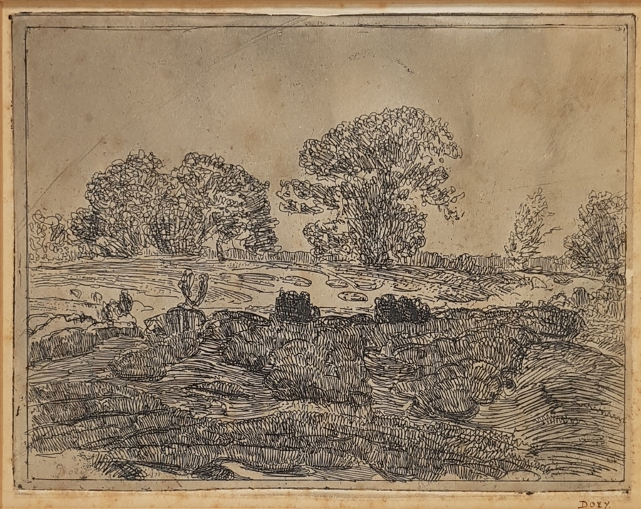 Ets op papier van Reinhart Dozy (1880–1947), circa 1920, uitgevoerd in naturalistische stijl. Landschappelijke voorstelling met bomen en struikgewas in fijne lijnvoering en kruisarcering. Gesigneerd rechtsonder in de marge met “DOZY”.