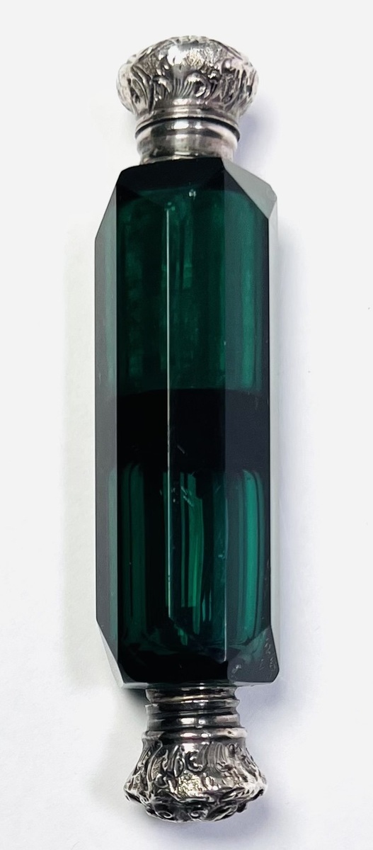 Victoriaanse parfumflacon, eind 19e eeuw, uitgevoerd in donkergroen facetgeslepen glas met gegraveerde zilveren doppen. Het object heeft een achtkantige vorm met symmetrische florale motieven op beide zilveren eindstukken. Eén dop opent scharnierend, de andere is schroefbaar. Inclusief intern glazen applicatorstaafje. Draagbaar type flacon voor reistoepassing of gebruik aan een chatelaine.
