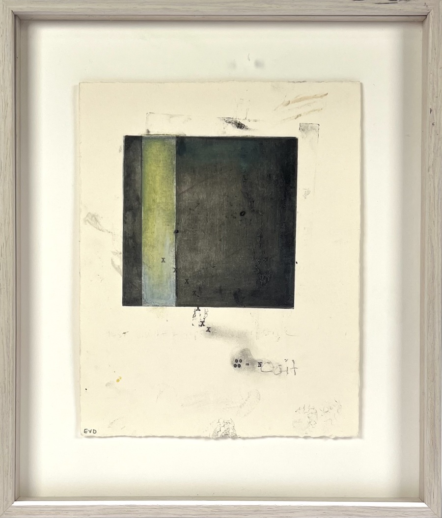 Een unica diepdruk monoprint getiteld "Ooit", door Esther van Dijk (1971), gedateerd 2020. Het abstracte werk op papier toont een compositie van een geelgroene en donkergrijze rechthoek, met handgeschreven tekstuele elementen. Linksonder gemonogrammeerd EVD en op de achterzijde gesigneerd en gedateerd 2020.