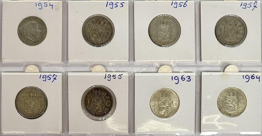 Set van acht Nederlandse guldens uit 1954–1964 met portret van koningin Juliana (1909–2004), uitgevoerd in zilver en vervaardigd via slagtechniek. De realistische stijl toont haar profiel met opschrift, terwijl de keerzijde het Nederlandse wapen met jaartal en waarde “1 G” weergeeft.