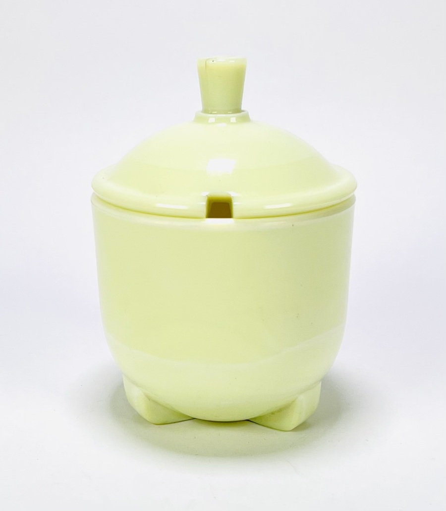 Gele colopal glazen jampot ontworpen door A.D. Copier (1901-1991) en uitgevoerd door Glasfabriek Leerdam, gedateerd 1931. Onderzijde meegeperst merk ontwerper. Afgebeeld in Leerdam Glas 1878-2003, A. v.d. Kley-Blekxtoon; pag.101.