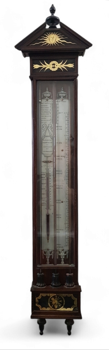 Empire bakbarometer met thermometer en controleur, omstreeks 1820–1840, vervaardigd door J.M. Pagani Groningen. Uitgevoerd in gelakt mahoniehout, glas, papier en metaal, met schaalverdeling in Engelse en Rijnlandse duimen. Voorzien van decoratieve timpaan, zonnesymbool, verguld ornament en gesigneerd schaalbord. Temperatuuraanduiding in Réaumur en Fahrenheit. Het object diende voor binnenhuisgebruik en weersvoorspelling.