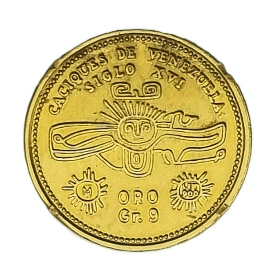Gouden munt, met een portret van Guacaipuro, een cacique uit de 16e eeuw en de inscriptie 'GUAICAIPURO' op de voorzijde. De keerzijde toont een abstracte zon met symbolen en 'ORO Gr. 9'. De munt is uit de tweede helft van de 20e eeuw en is geslagen uit goud (900/1000), een herdenkingsuitgifte uit Venezuela. Deze munt is onderdeel van een serie gewijd aan inheemse leiders.