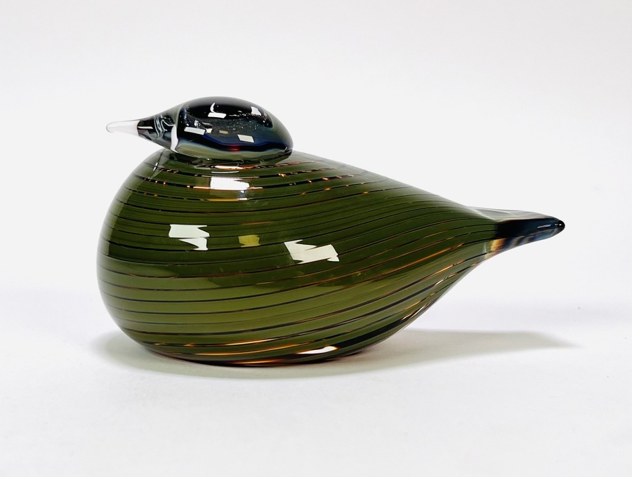 Glazen vogel in modern Scandinavisch design door Oiva Toikka (1931–2019) voor Iittala, Finland, 2004. Handgeblazen glas met groen en blanke horizontale strepen met een helder snaveltje. Strakke, gestileerde vormgeving. Onderzijde gesigneerd en voorzien van Iittala sticker. Uitgevoerd als onderdeel van de Birds by Toikka-collectie, kenmerkend voor het Finse studioglas.