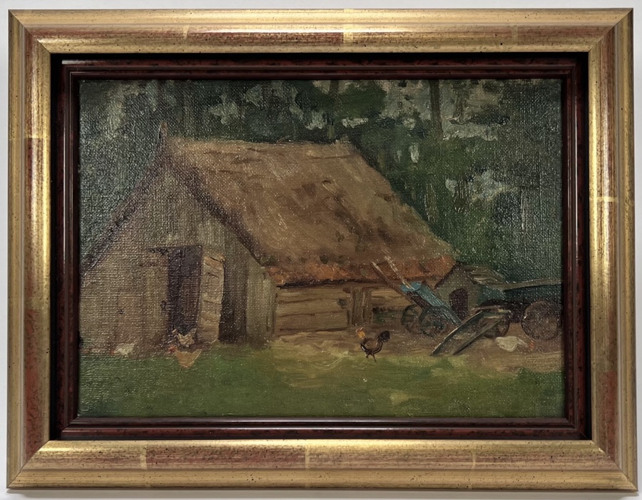 Schilderij van een onbekende maker, gedateerd circa 1890-1920, olieverf op doek. Het realistische landschap toont een boerenwoning met rieten dak, omringd door groen, met landbouwwerktuigen en scharrelende kippen. De schilderstijl kenmerkt zich door zichtbare penseelstreken en een ingetogen kleurenpalet, ongesigneerd. Herkomst Galerie Wiek XX Bad Nieuweschans.