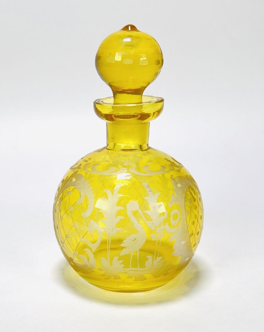 Geel glazen parfumflesje met stop, uitgevoerd in transparant glas met deels gematteerde florale decoraties en vogelmotieven. Midden 20e-eeuws object, vervaardigd in geslepen en geëtst glas, met bolvormig lichaam en bijpassende bolstop. De stijl vertoont invloeden van Midden-Europese sierglasproductie.