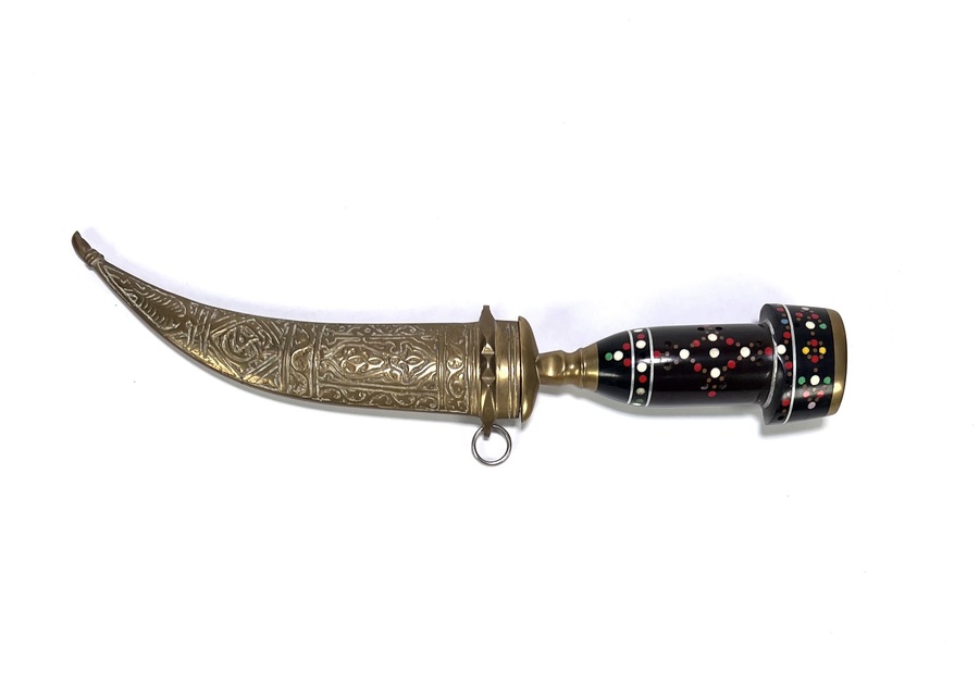 Traditionele jambiya-dolk uit de Arabische wereld, gedateerd midden 20e eeuw, met gebogen stalen lemmet en decoratieve messing schede voorzien van islamitische kalligrafie. De donkere greep is uitgevoerd in hout en ingelegd met gekleurde stippen en witte decoratie. De messing pommelkap toont een floraal motief. Ceremonieel object in Jemenitisch-Omaanse stijl.