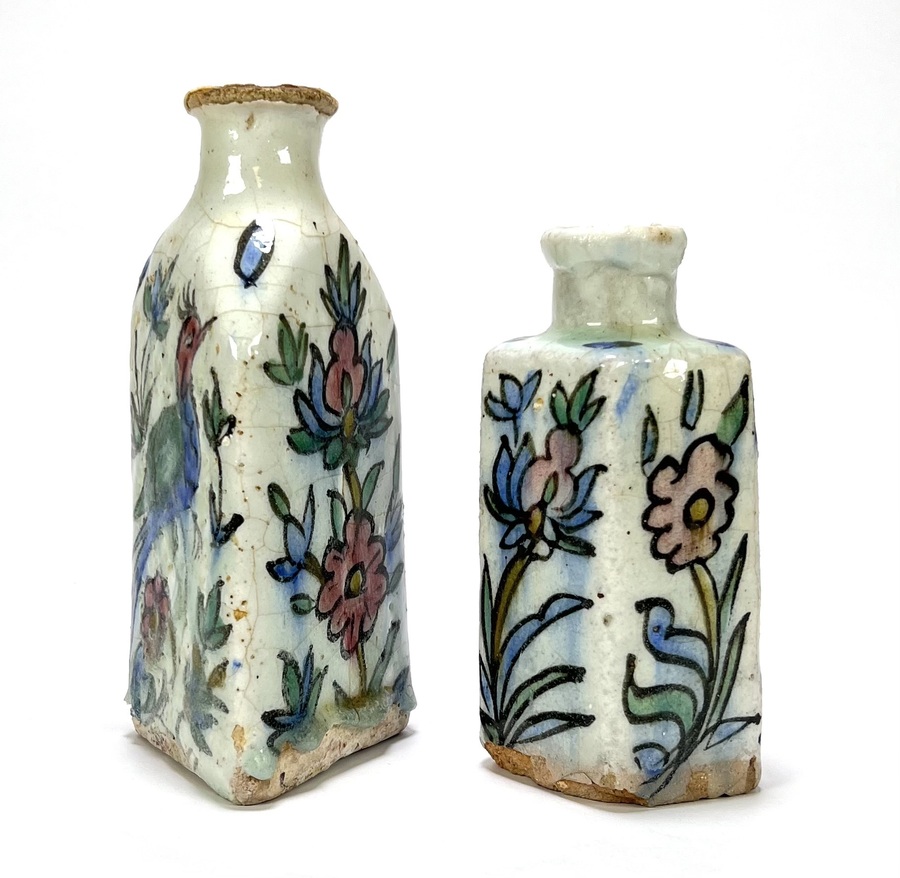 Twee handgevormde aardewerken Qajar flesjes uit de 19e of vroege 20e eeuw, met veelhoekige bases en decoraties in Perzisch-Islamitische stijl. Het ene exemplaar toont florale motieven en een vogel, het andere enkel bloemen, beide uitgevoerd in onderglazuur op crèmekleurig fond. De craquelé glazuur en onregelmatige vormen wijzen op ambachtelijke Midden-Oosterse productie.