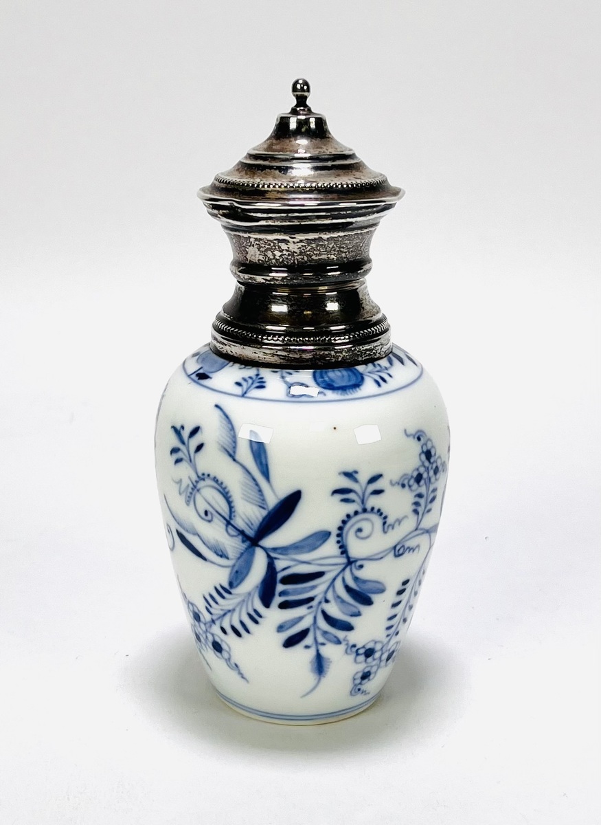 Porseleinen vaasje met zilver montuur gemerkt met zwaardje, Meissen-stijl, eerste helft 20e eeuw. Peervormig vaasje met kobaltblauwe bloem- en bladrankdecor in Zwiebelmuster traditie. Onderzijde gemerkt in blauw met met stippen en letter H. Europees werk in barok geïnspireerde stijl met Chinese invloeden.