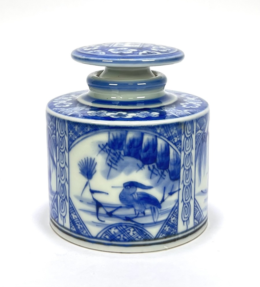Porseleinen theebus in Arita stijl, gemerkt Fukagawa Seiji, Japan, omstreeks 1900. Beschilderd in blauw onderglazuur (sometsuke) met panelen van eenden en reigers in rivierlandschappen, omgeven door bloesemranden en geometrische patronen. Gemaakt van geglazuurd porselein met handgeschilderde decoratie in traditionele Japanse techniek.