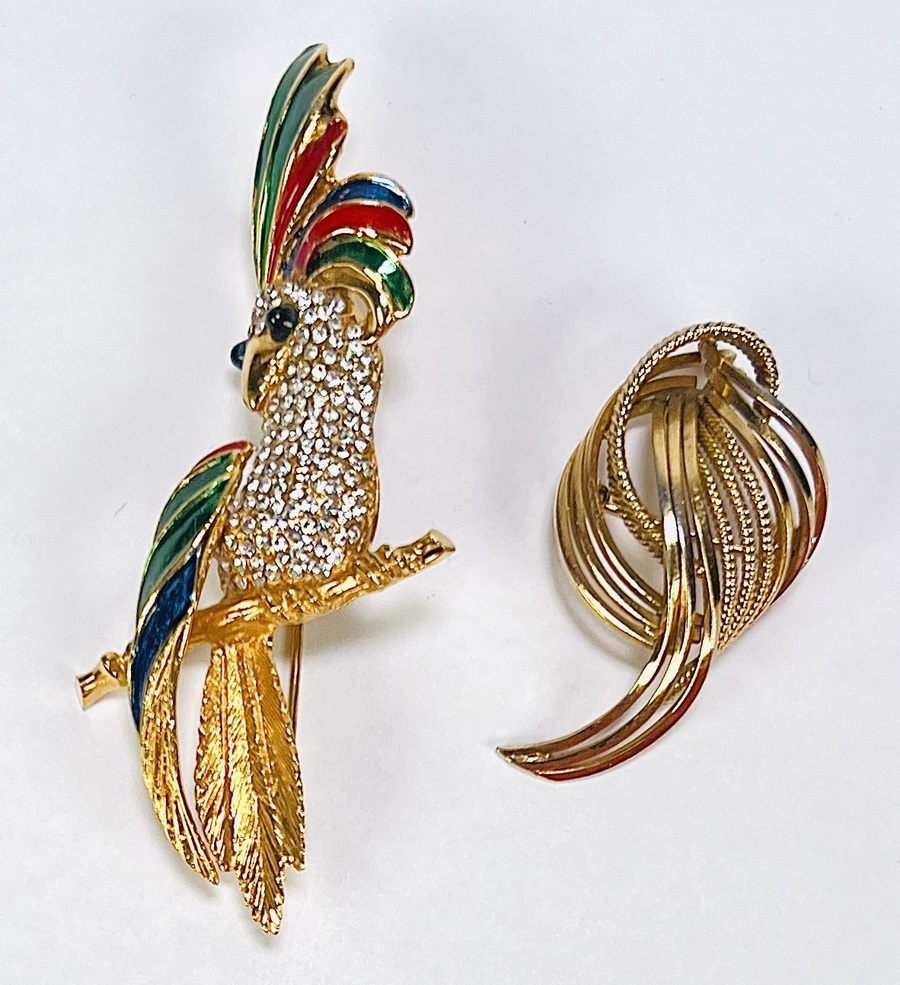 Een vintage set van twee broches. Een figuratieve kaketoe-broche van Carven, circa 1950-1970, van verguld metaal met strass-steentjes en kleurrijk emaille. Gemerkt "CARVEN 169 MODÈLE DÉPOSÉ" op de achterzijde. De tweede broche, van Grosse, gedateerd 1967, is abstract gevormd van verguld metaal met gelaagde, vloeiende lijnen. Gemerkt "GROSSE 67 GERMANY" op de achterzijde.