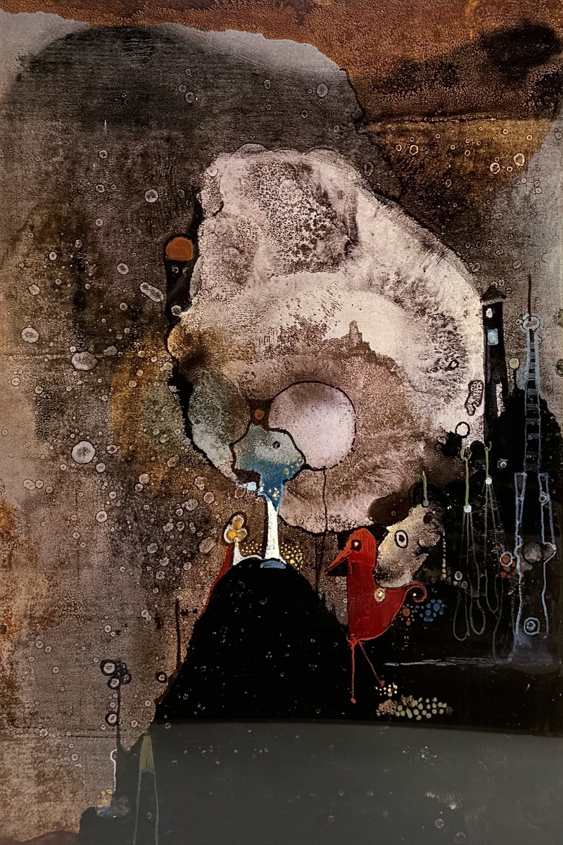 Een abstract werk met surrealistische elementen, gedateerd circa 1960-1990. Uitgevoerd in gemengde techniek op papier, toont het een complexe compositie met een grote organische vorm, een abstracte berg en een vogelachtige figuur. De textuur en het gedempte kleurenpalet zijn kenmerkend. Rechtsonder onduidelijk gesigneerd, met oplagenummer 264/500 linksonder.