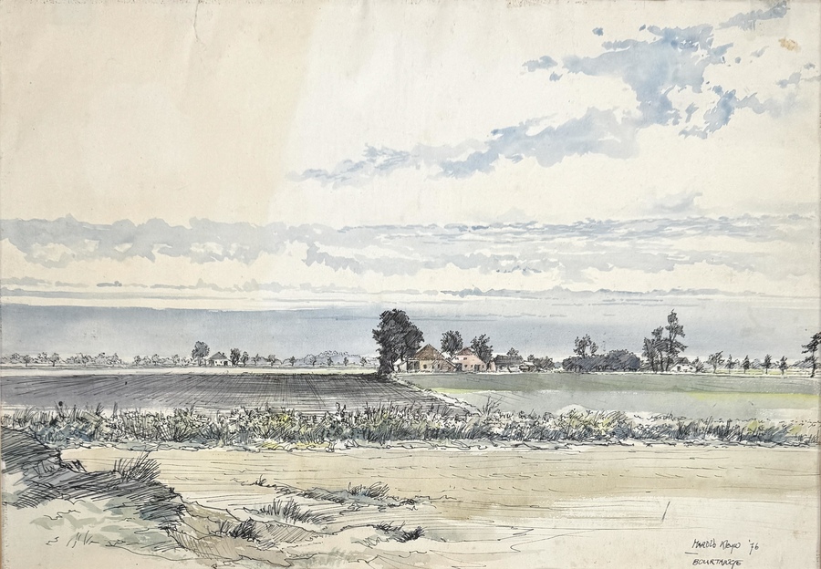 Tekening in pen en inkt met aquarel van Harold Kleyn (1946), getiteld “Bourtange” en gedateerd 1976, uitgevoerd op papier. Dit realistische landschap toont Bourtange met uitgestrekte akkers, boerderijen en bomen onder een bewolkte lucht. De aquareltechniek draagt bij aan de atmosferische weergave. Rechtsonder gesigneerd en getiteld.