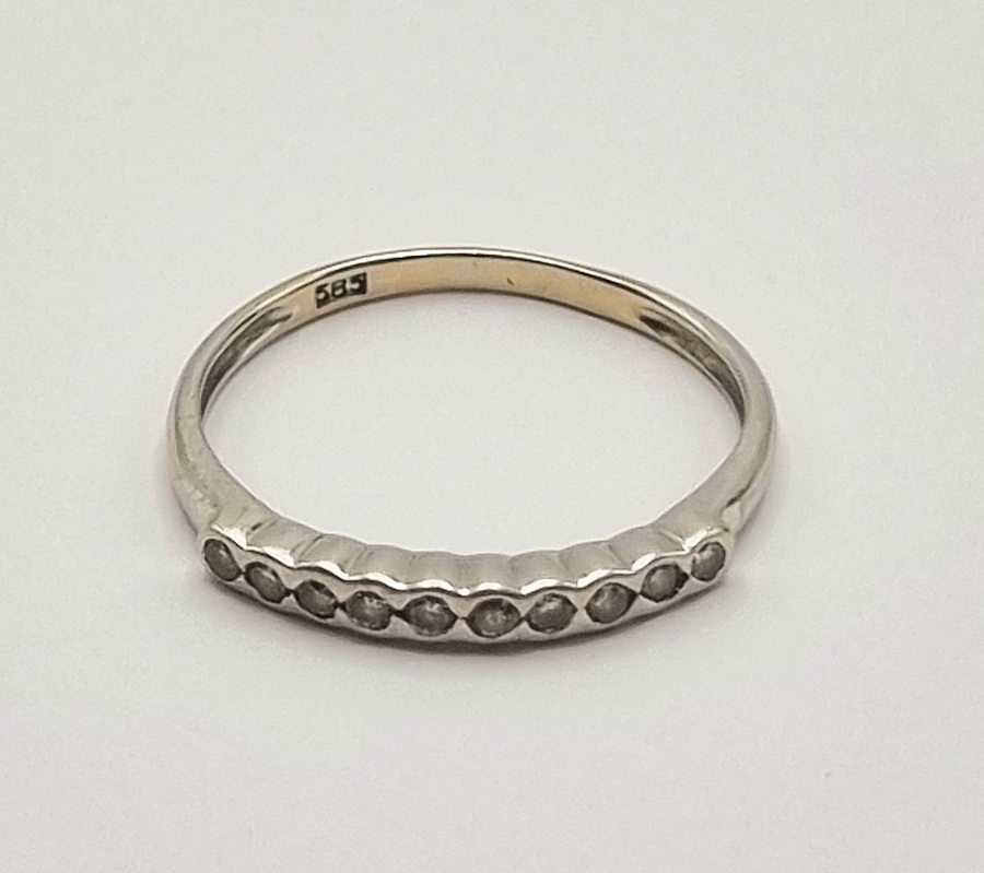 14 karaat wit gouden ring bezet met tien diamantjes. De ring is omstreeks de tweede helft van de 20e eeuw vervaardigd door middel van smeden en het zetten van de stenen. Binnenzijde ring gemerkt 585.
