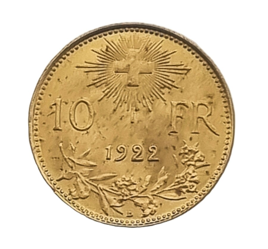 Zwitserse 10 frank 1922, ontwerp door Fritz Ulysse Landry (1842–1927), uitgevoerd in numismatische stijl. Geslagen in goud 900/1000. Voorzijde met allegorische buste van Helvetia en opschrift “HELVETIA”, voorzijde linksonder gesigneerd “F. LANDRY”; keerzijde met stralend Zwitsers kruis boven “10 FR”, jaartal 1922 en muntteken “B” (Bern). Rand geribbeld; uitgave binnen de Vreneli-serie. Met florale takken onderaan en kralenrand aan weerszijden.