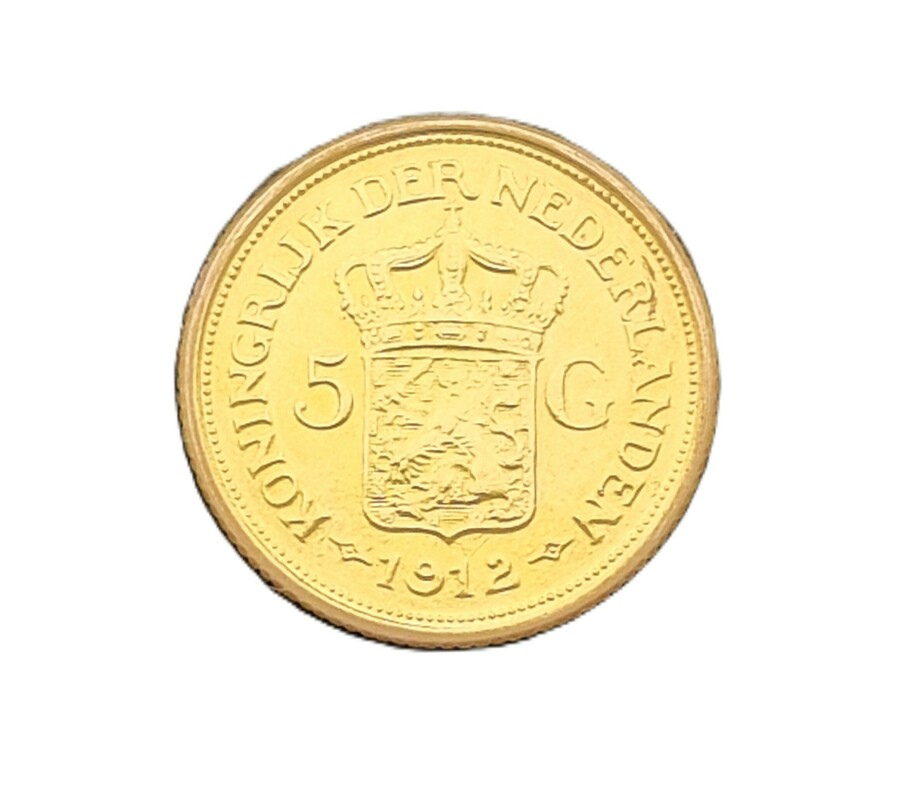 Gouden vijfje, met de jaartalvermelding 1912 op de voorzijde. De 14 karaat gouden munt is een naslag van een origineel Nederlands vijfje. De voorzijde toont het gekroonde rijkswapen met de waarde aanduiding 5 G, terwijl de keerzijde een portret van Koningin Wilhelmina bevat.