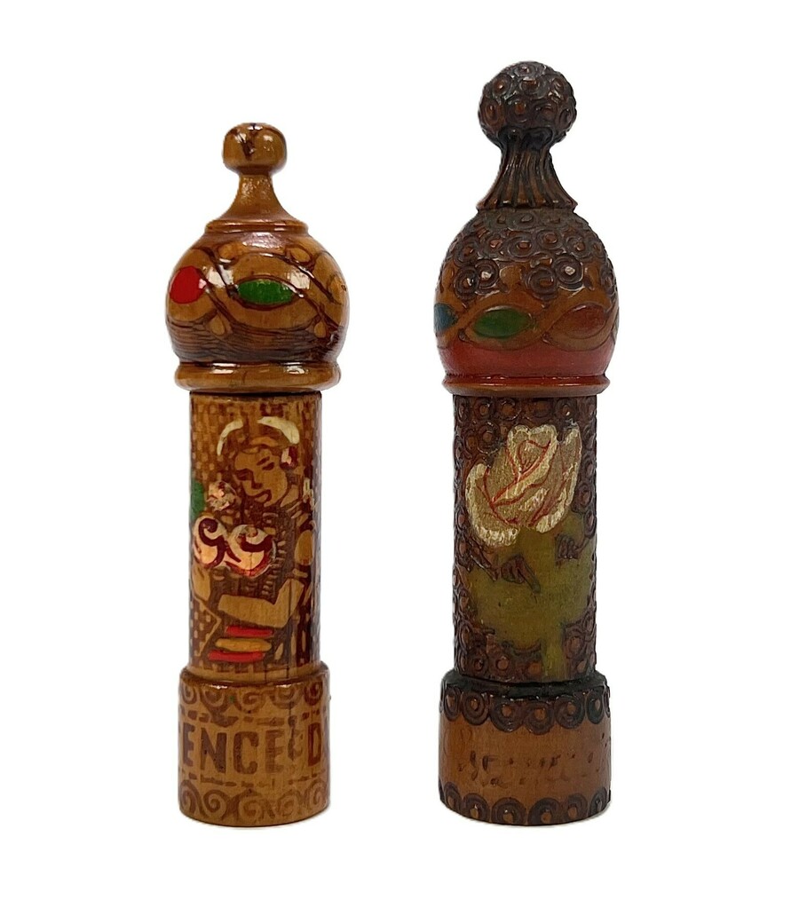 Set van twee houten essenceflacons, omstreeks midden 20e eeuw, vervaardigd in Balkanstijl. De hulzen zijn gedraaid en handbeschilderd, met gestileerde bloemen en figuren. Inwendig bevindt zich een glazen essenceflesje met dop. Opvallende elementen zijn de ingelegde kleuraccenten en decoratieve doppen. Volkskunst uit Roemenië of Bulgarije.