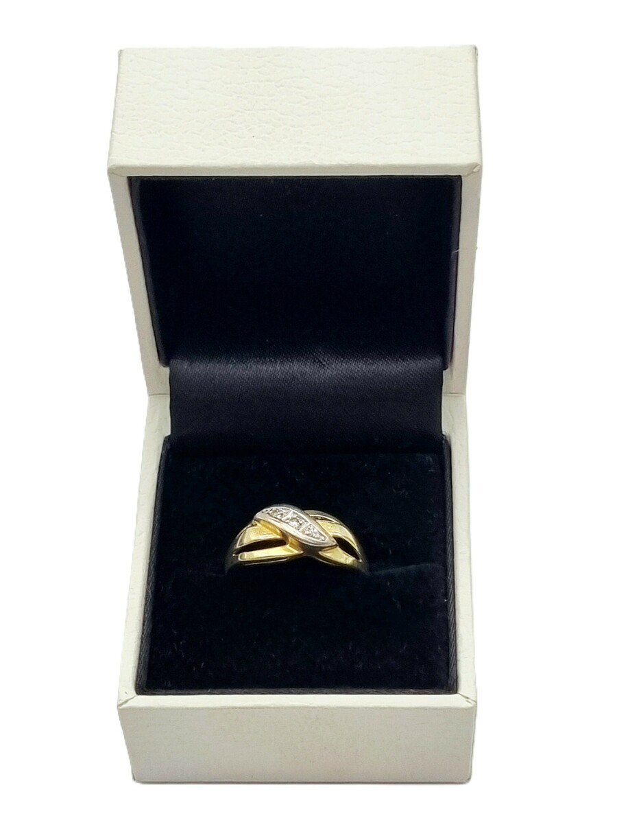 Gouden ring uit circa de tweede helft van de 20e eeuw. De ring is vervaardigd van 14 karaat goud in een tweekleurig design van geel en wit goud. De ringband wordt gevormd door gekruiste banden, met diamanten gezet in het witgouden gedeelte. Deze tweekleurige ring is een voorbeeld van moderne sieraden met een dynamische vormgeving. Binnenzijde gemerkt met meesterkeur LL en 585.